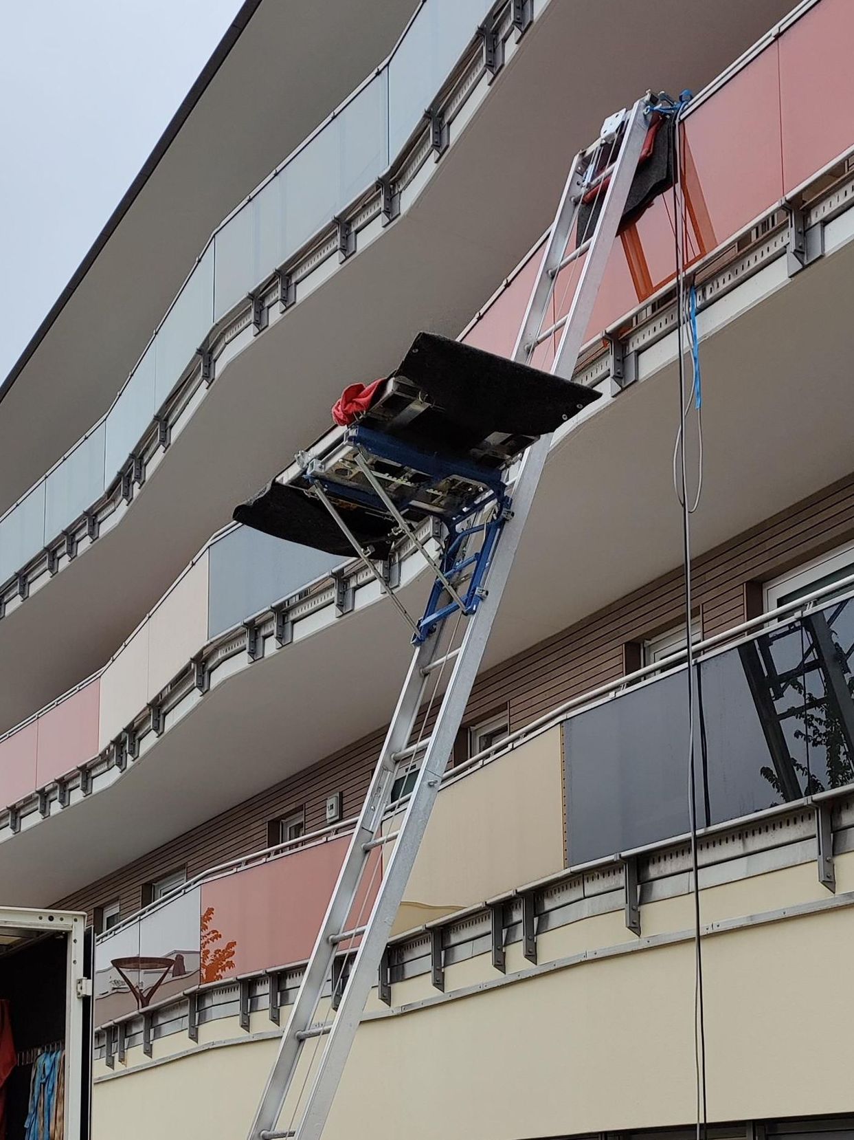 Der Möbellift wird dabei, ähnlich wie eine Leiter, schräg an das Fenster oder den Balkon angelegt und sicher festgezurrt.